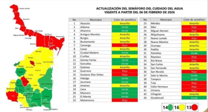 La presión sobre las fuentes de abastecimiento llevó a las autoridades estatales a actualizar el Semáforo del Cuidado del Agua, colocando en color rojo a 13 municipios de Tamaulipas, entre ellos Ciudad Victoria y la mayoría de la franja fronteriza, ante la baja disponibilidad del recurso y el riesgo de un mayor deterioro de las reservas.
